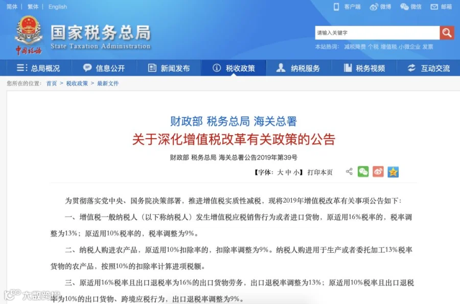 同日,财政部、税务总局、海关总署联合发布《关于深化增值税改革有关政策的公告》(财政部 税务总局 海关总署公告2019年第39号),并公布一系列深化增值税改革的配套举措。 |