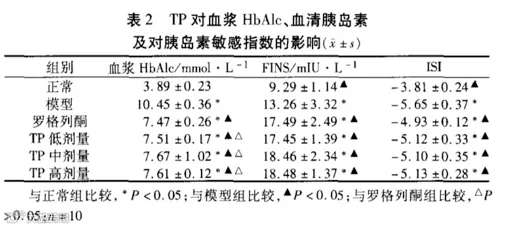 表2得出,模型组大鼠血浆HbAlc水平明显增高,TP(银耳多糖)各治疗组血浆HbAlc水平显著降低。治疗后TP高剂量组与罗列格酮(一种降糖药)组无显著差异。