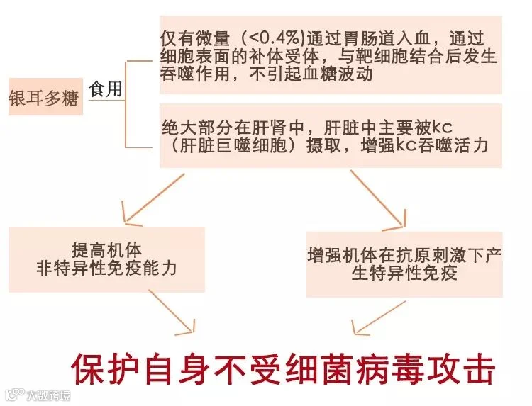 银耳多糖口服后仅有微量(<0.4%)通过胃肠道入血,不引起血糖的波动。绝大部分被肝脏中的kc(肝脏巨噬细胞)所摄取。