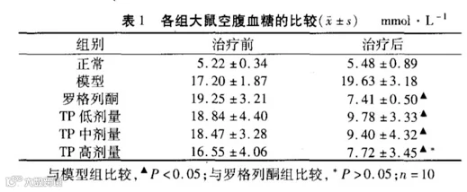 表1得出,模型组大鼠FBG(空腹血糖水平)明显高于正常组,TP(银耳多糖)各治疗组均可降低糖尿病大鼠的FBG(空腹血糖水平),治疗后高剂量组与罗列格酮(一种降糖药)组无显著差异。