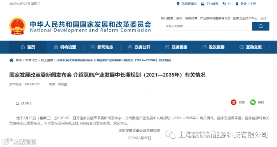 3月23日(星期三)上午10:00,国家发展改革委召开新闻发布会,介绍氢能产业发展中长期规划(2021—2035年)有关情况,国家发展改革委、国家能源局有关负责同志出席发布会。
