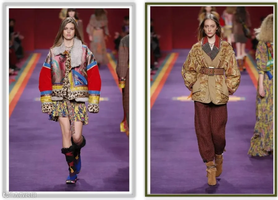天觉灵主题 为2019/20秋冬打造出全新 复古 造型,这一场异域文化的探索之旅,其中麂皮绒/皮毛一体外套点亮了整个系列的故事。带有一点嬉皮一点成熟一点的民族风,很符合游牧风略微粗犷的气质。内搭花纹衬衫或者印花长裙,既时髦又呼应民族风主题。