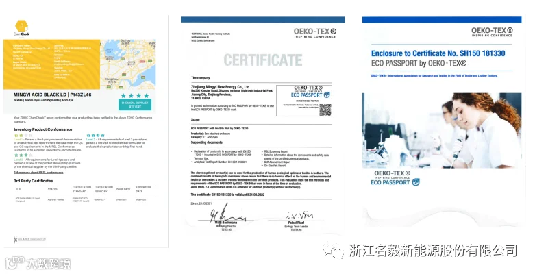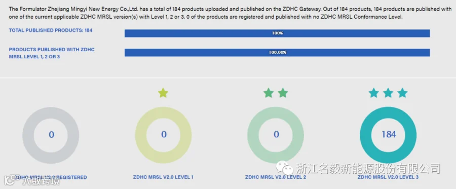 名毅染料已将合规并获得等级的产品在ZDHC Gateway上进行了注册。目前Gateway上公开的产品总数为184只,其中,分散73只,酸性111只。所有的产品也同时符合Bluesign、Standard 100 by Oeko-Tex Class I要求。