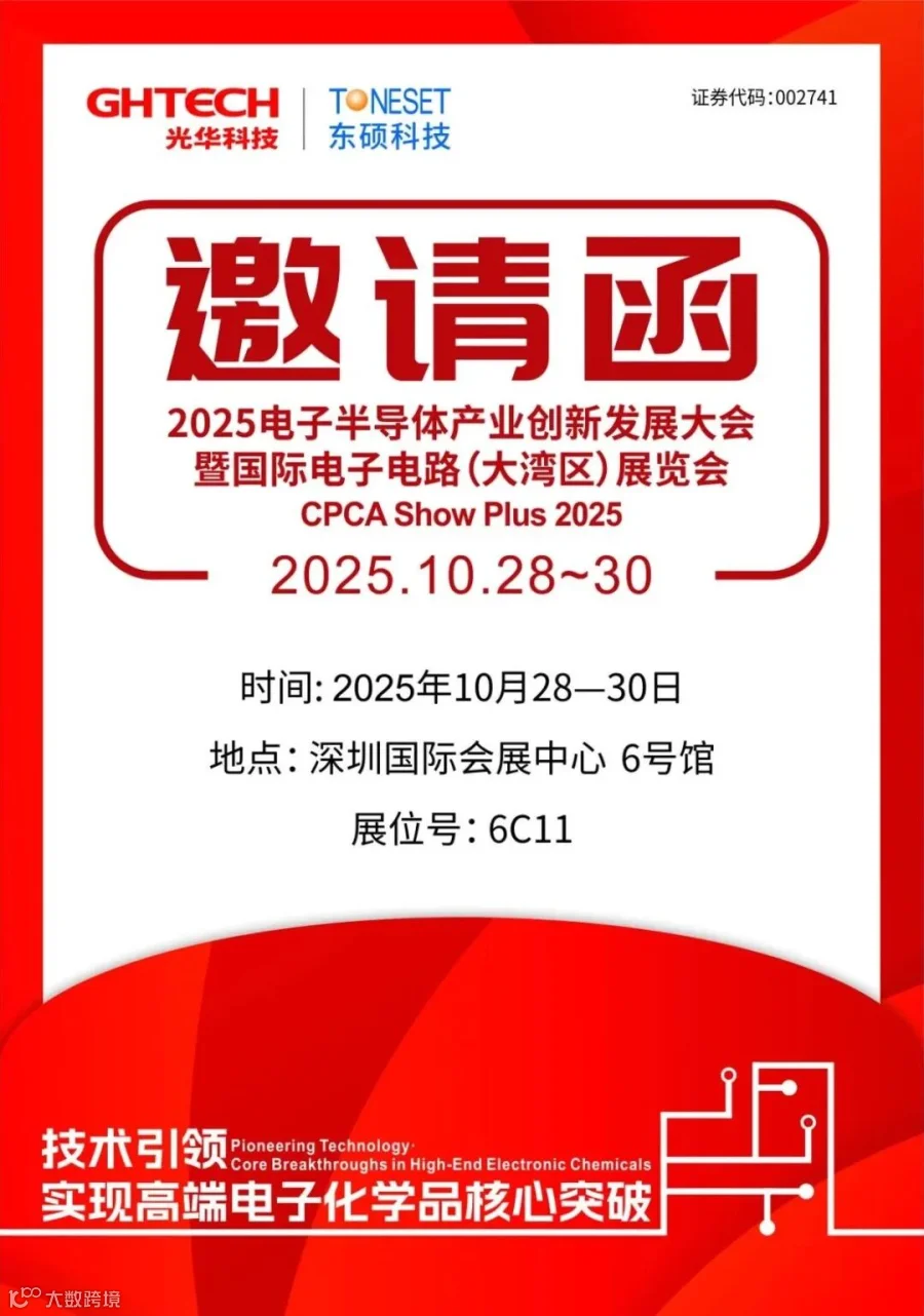 10月28日至30日,2025 电子半导体产业创新发展大会暨国际电子电路(大湾区)展览会(CPCA Show Plus)将在深圳国际会展中心(宝安)盛大举行。GHTECH光华科技携手成员企业TONESET东硕科技将以“技术引领 · 实现高端电子化学品核心突破”为主题,携PCB、封装载板以及先进封装互连技术等创新方案亮相。诚邀您莅临6号馆6C11展台现场交流,共同探讨AI时代下新一代的技术创新。