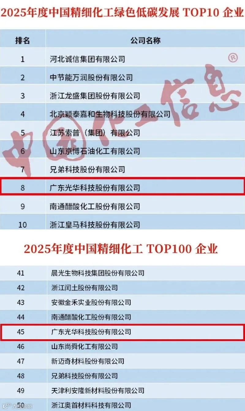 本次评选严格依据《精细化工产品分类》标准所界定的行业范围展开。评价体系围绕经营管理能力、创新能力和绿色发展能力三大维度,设置了3项一级指标及15项二级指标,具体涵盖营业收入、毛利率、研发投入、新化学物质申报数量、绿色工厂认定情况、碳排放量等关键评价内容。 光华科技凭借稳健的综合实力与在可持续发展方面的贡献荣登“2025年度中国精细化工TOP100”第45位,并入选“绿色低碳发展TOP10”企业第8名,以双榜荣耀有力回应了行业“精细化、绿色化、数智化”的发展趋势。