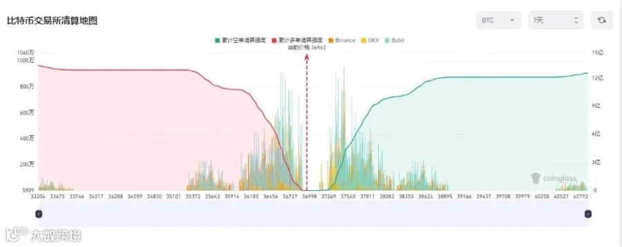 i. 从本周中心化交易所合约交易BTC清算地图来看,BTC本周多单比空单累计清算强度的差值几乎没有,多单方面在36887至35998为密集清算区,有累计10.76亿美元的清算强度,空单方面距离当前价位存在真空区,在37251至38191为密集清算区,有累计10.19亿美元的清算强度。