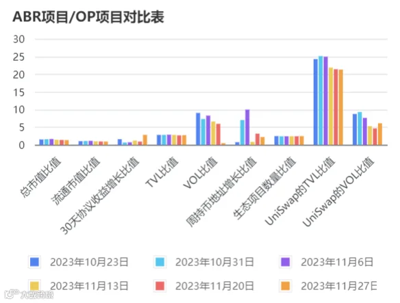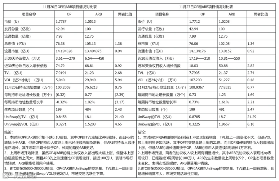 2. 上周市场升温,两者的协议收入较上周有明显增长,ARB的协议收入已连续3周周增长100万U。ARB的生态数量较上周增长5个,OP生态项目数量未变化。表明市场回暖时,ARB更受用户青睐。