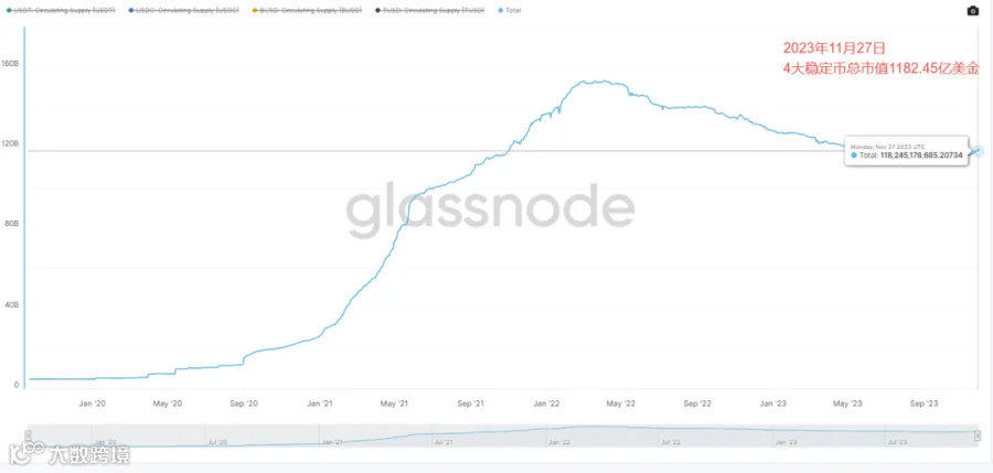 2. 四大稳定币总市值1182.45亿美金,较上周的1172.77亿美元,再次增加约9.68亿美金。