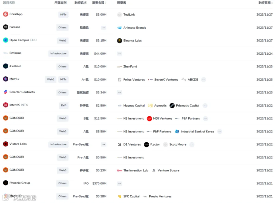 一级市场融资数量与金额都有不同程度的下降,BTC长时间维持高位震荡,山寨币持续下跌不跟涨,整体判断山寨庄家对后市行情的不看好,一级市场情况也随之遇冷。