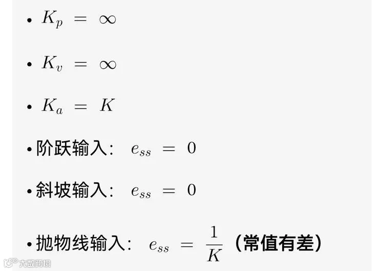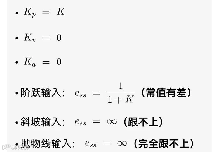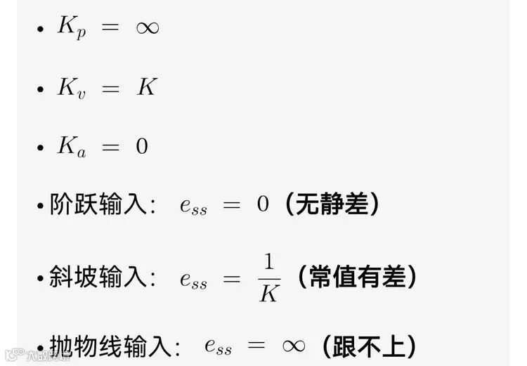 物理意义:Ⅰ型系统对阶跃无静差,对斜坡有静差,不能跟踪抛物线。