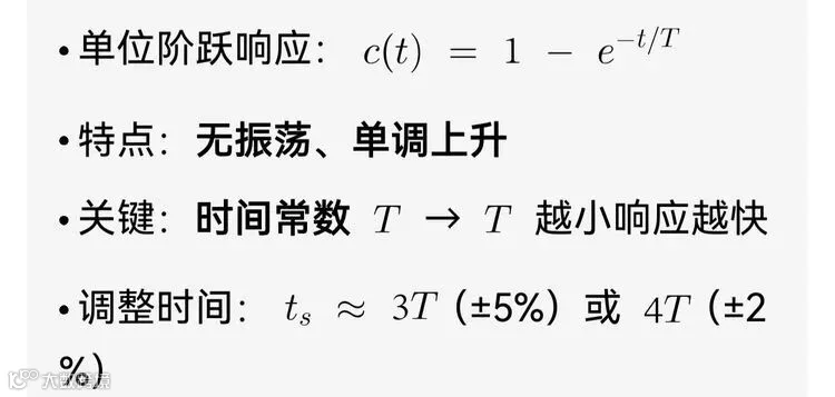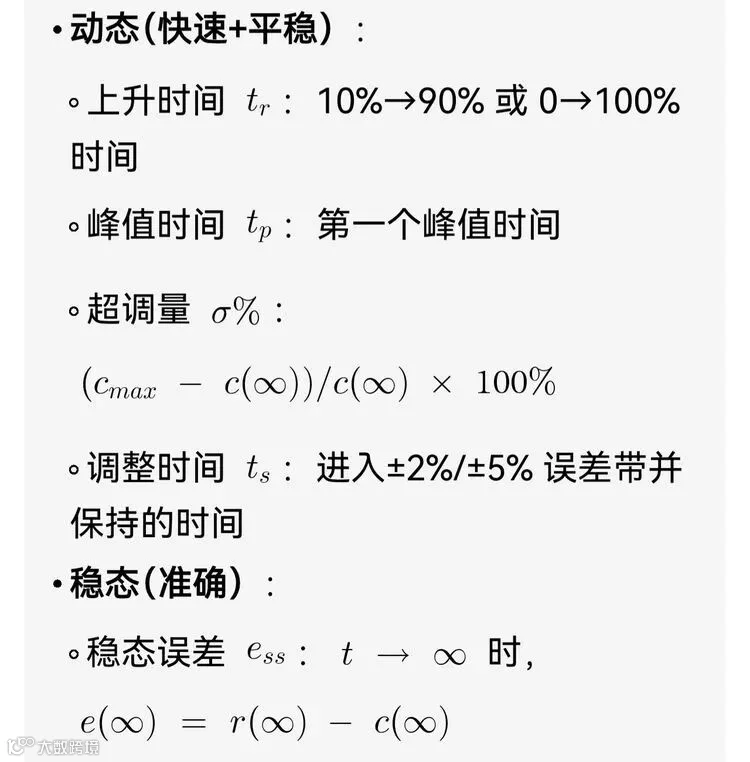 调节时间(Settling Time, ( ts )):系统响应到达并保持在稳态值的±2%或±5%误差带内所需的最短时间。调节时间越短,系统过渡过程越快。工程上常采用±5%误差带,高精度系统可能采用±2%。