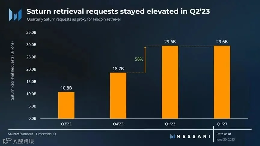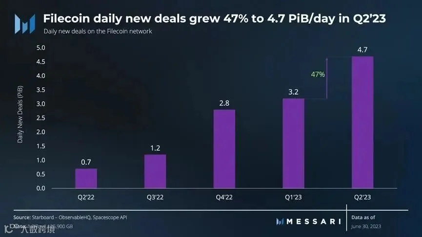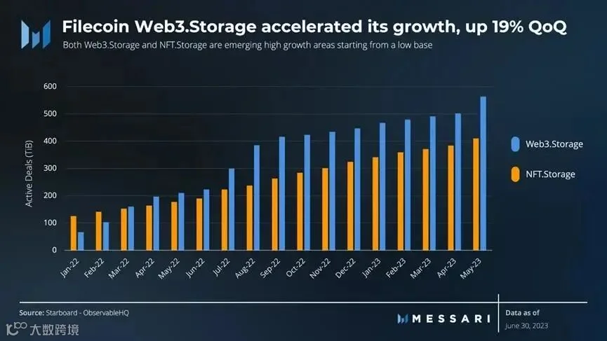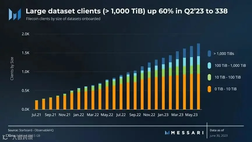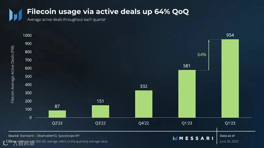 Filecoin的存储市场在2023年第二季度继续增长,活跃交易量环比增长64%。