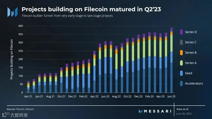 截至2023年7月,已知有391个项目正在Filecoin、IPFS和Protocol Labs Network生态系统上进行开发。2023年6月,加速器孵化的项目达到180个,高于2023年3月的150个。大多数利用Filecoin的应用程序和协议提供数据服务: