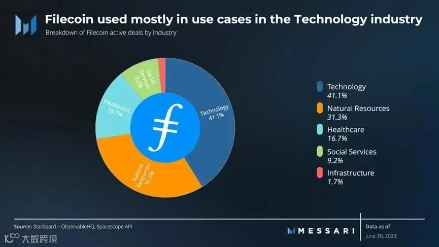 根据行业用例划分的活跃存储交易情况显示,最常使用Filecoin的行业是技术(41%)和自然资源(31%)。