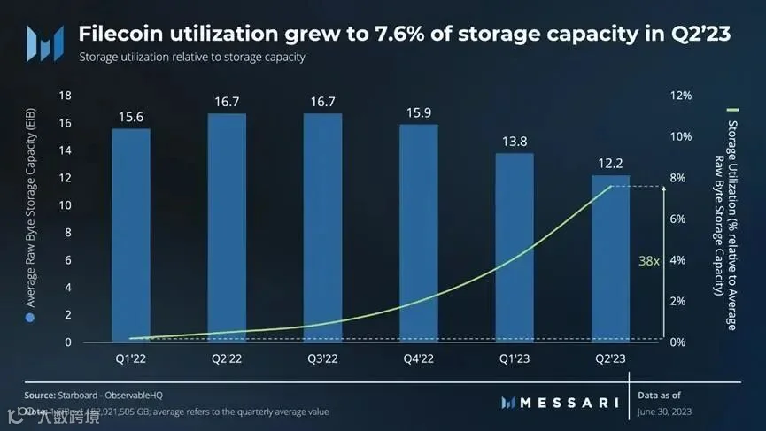Filecoin在2022年第二季度达到历史最高点后,经历了12%的环比下降,并在2022年第三季度稳定下来。与此同时,存储利用率相对于总可用存储容量在2023年第二季度增加到了7.6%,而2023年第一季度为4.1%。这种增加对于Filecoin的采用来说是一个积极的迹象。