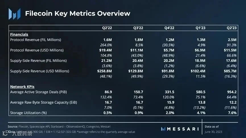 1. Filecoin在Q2'23的存储使用经历了加速增长,活跃存储交易量环比增长了64%。尽管存储容量环比下降了12%,但存储利用率从Q1'23的4.1%增长到了Q2'23的7.6%。与此同时,FIL费用收入在Q2'23增长了91%(按美元计算增长了67%),这是由于新存储交易量环比增长了47%。