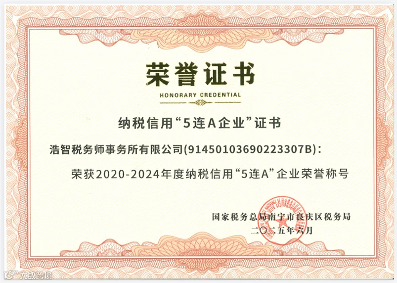 近日,浩智税务师事务所凭借依法纳税和诚信经营的良好表现,荣获纳税信用等级 “五连A”荣誉称号,这是税务部门对浩智税务师事务所合规经营,诚信纳税的权威认可。