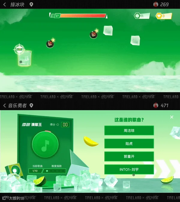 如果被“偷喝可乐”淘汰,但又没玩够,还可以前往雪碧音乐世界继续享受游戏的快乐。这里准备的两款小游戏也很有趣:一款是接冰块,可以左右移动杯子来接冰块,30秒内累积冰爽值,简单却不乏刺激;另一款是猜歌游戏,收听一段音乐来回答歌曲名字,是对听力及记忆力的双重考验。