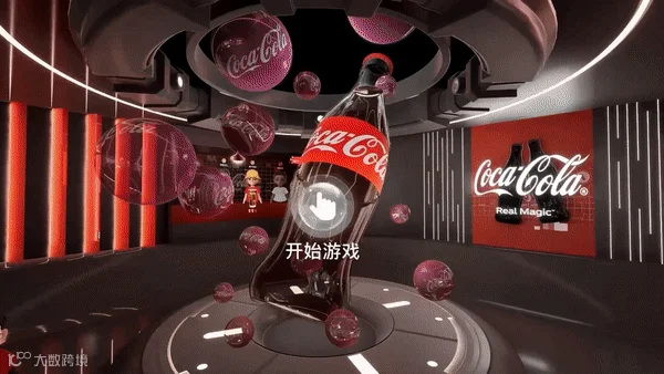 通过导引地图,Avatar可以在三个场馆间“单击空降”。在综合品牌活力空间,中心摆放着可口可乐旗下的各种饮料,数字化身可以任选一瓶拿在手上、开怀畅饮,甚至还可以和其他用户一起“碰一碰”,获得可口可乐“快乐瓶”。