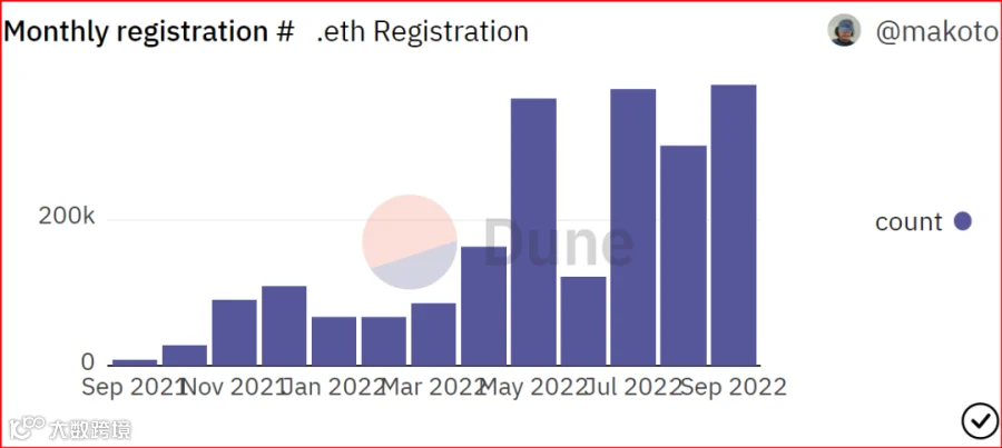 截至上个月底,ENS 总域名数量达到 217 万个,如今 9 月份尚未结束,注册量便超越 7 月份达到 38 万个,再创历史新高,这也可以视为观察 Web3 用户及活跃体量的绝佳入口。