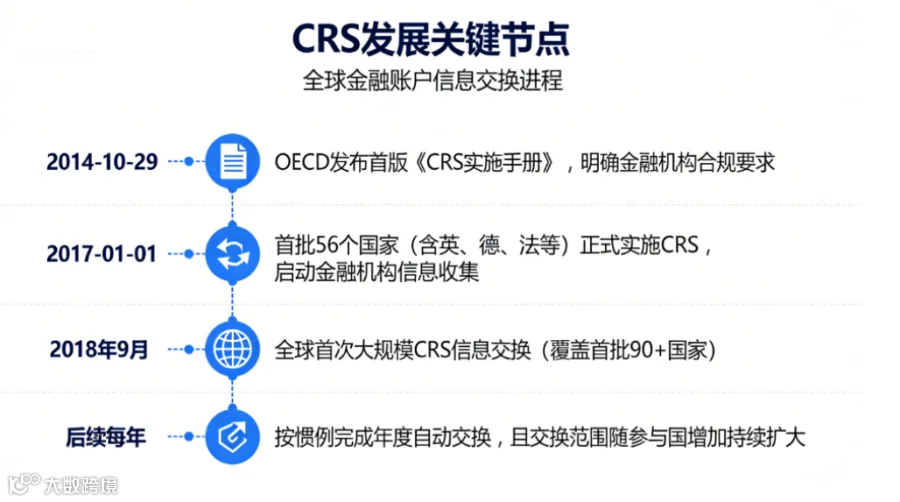 中国角色,中国自2017年起实施CRS,2018年9月完成首次信息交换,目前已与超过100个国家和地区建立自动交换关系。
