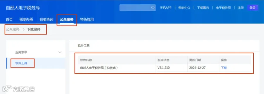 一、软件下载:通过网址https://etax.chinatax.gov.cn登录【自然人电子税务局】-【公众服务】-【下载服务】-【软件工具】- 下载自然人电子税务局(扣缴端)。