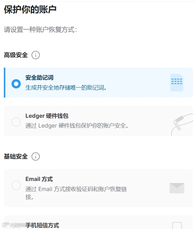 2、选择账户保护方式(助记词、硬件钱包、E-Mail、短信 共四个选项)