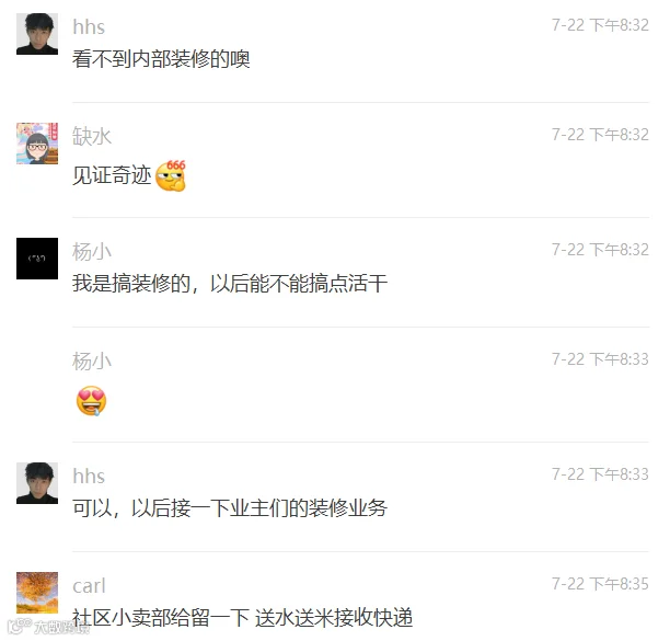 由于小区大部分房产的套内并没有设计和装修,部分搞装修的业主表示可以承接装修业务。部分业主发现社区还没有小卖部,对后续生活可能造成影响,于是纷纷催促开发商抓紧设置小卖部,以承接送米送水、快递存放的业务。