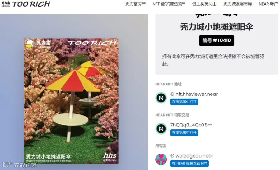 该笔交易通过智能合约自动调用执行并全程记录在了NEAR区块链上,不可逆、不可篡改、记录永久保存,并由NEAR的所有节点以及社区用户见证。也就是说,这把编号为T0410的遮阳伞NFT就永远属于账户持有者了,除非持有者自己出售或者转赠给了他人。