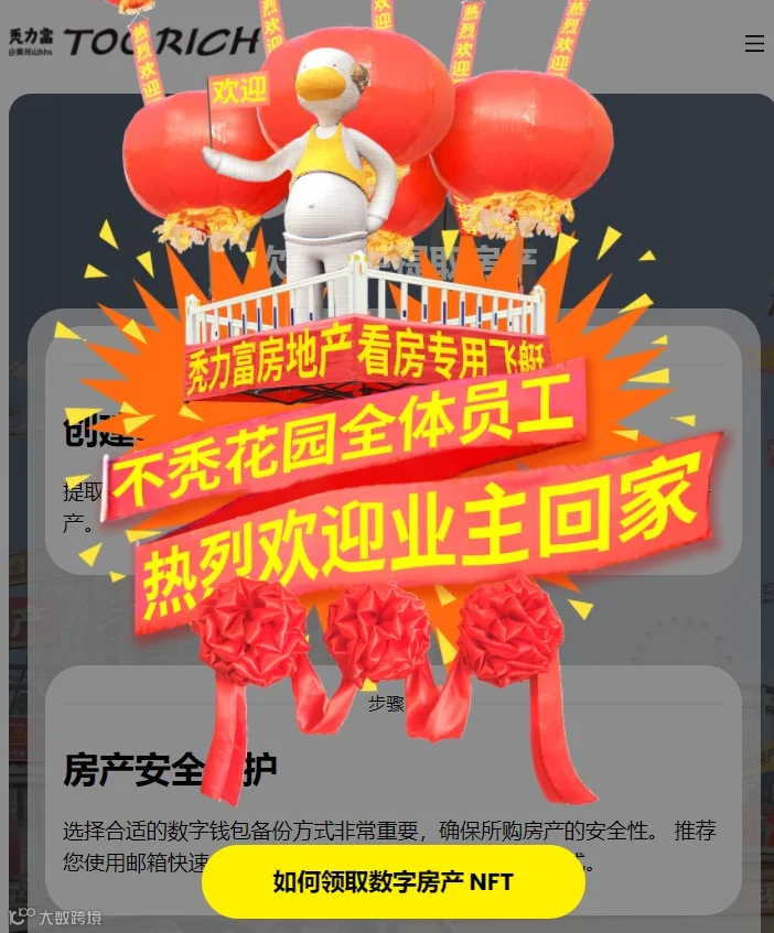 这位穿着黄背心、秃头、啤酒肚的中年地产老板,也就是不秃花园小区楼盘的开发商“秃力富”先生举着一个“数字房产”的牌子立在一边,亲自代言“秃力城”的数字房产。