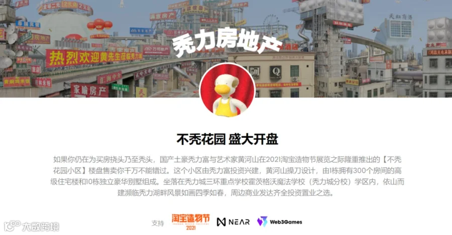 近年来,对于NFT艺术品(加密数字艺术品)的火爆,例如支付宝付款码皮肤NFT在闲鱼上挂价高达150万元、万维网源代码NFT被拍到了540万美元、艺术家Beeble的数字作品NFT更是拍出6900万美元的天价等相同的例子不胜枚举。此次坐落于“秃力城”的“不秃花园小区”是由淘宝造物节、公链平台NEAR、Dapp开发团队Web3games支持的“NFT数字加密房产”。
