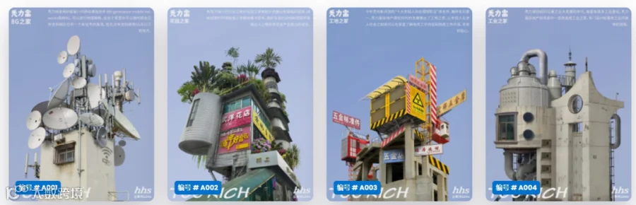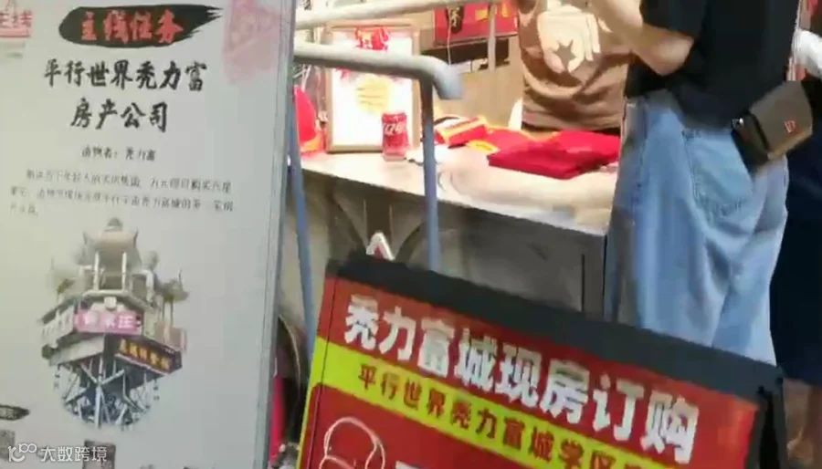 展台一侧摆放着“平行世界秃力富房产公司”的房产证样本和购买流程,看着“天台售楼处”、“八天连锁酒店”、“各种足疗”的招牌等取材自现实生活街头巷尾而又透露着一股“野生”气息的房产设计,许多人都被逗乐了。