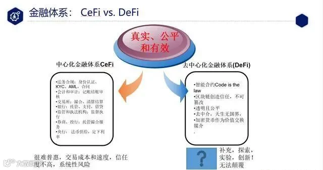 DeFi的特殊性在于去中心化的分布式金融。与之对应的就是中心化的金融。我们要对比一下两者,分析DeFi为什么能蓬勃发展,速度那么快。
