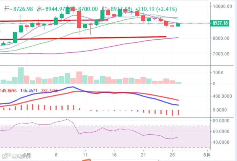 昨日BTC窄幅震荡,技术指标看RSI超买迹象缓解,MACD显示下跌动力减弱,预计后市将继续在9000美金一带上下震荡,60日线逐渐抬高,目前建议观望为主,等待方向。