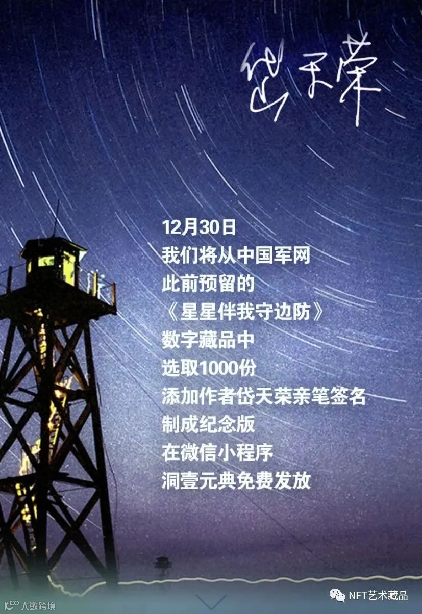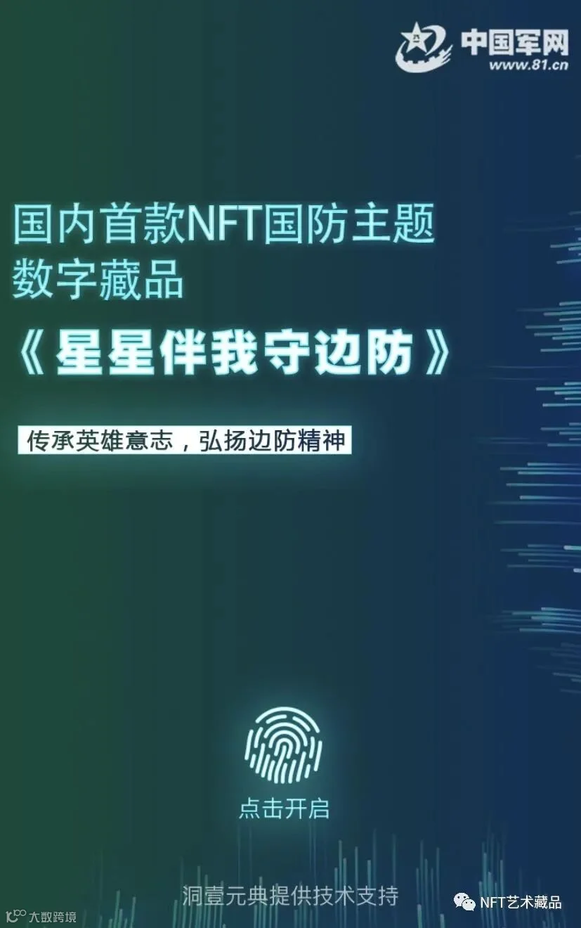 此前中国军网联合洞壹元典平台发行了国内首款NFT国防主题数字藏品《星星伴我守边防》,当天,这款数字藏品限量发行5000份刚上线就被一抢而空。