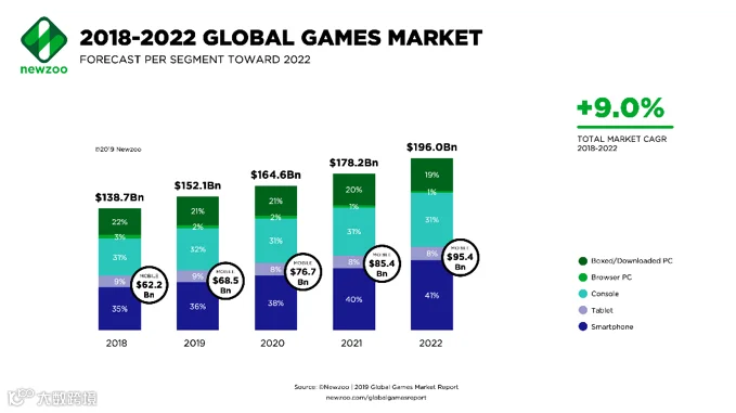游戏市场直到现在仍然是个快速增长的大蛋糕。Newzoo的一份对于游戏产业的报告中指出到 2022 年,消费者在游戏上的支出将增长至 1960 亿美元,2018 年至 2022 年的复合年增长率为 +9.0%。