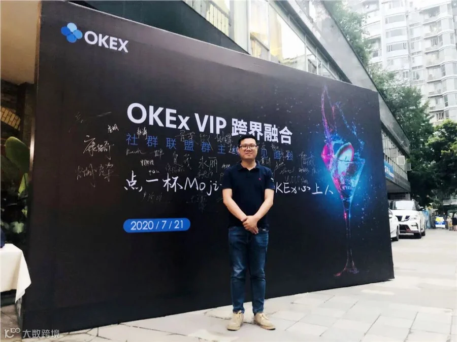 上图是钟国栋最近参加成都OKEx VIP跨界融合社群联盟群主线下见面会拍的照片,背景墙的「跨界融合」四个字是那么的天时地利人和,完美印证了他这两个月跨岗位发展的变化。