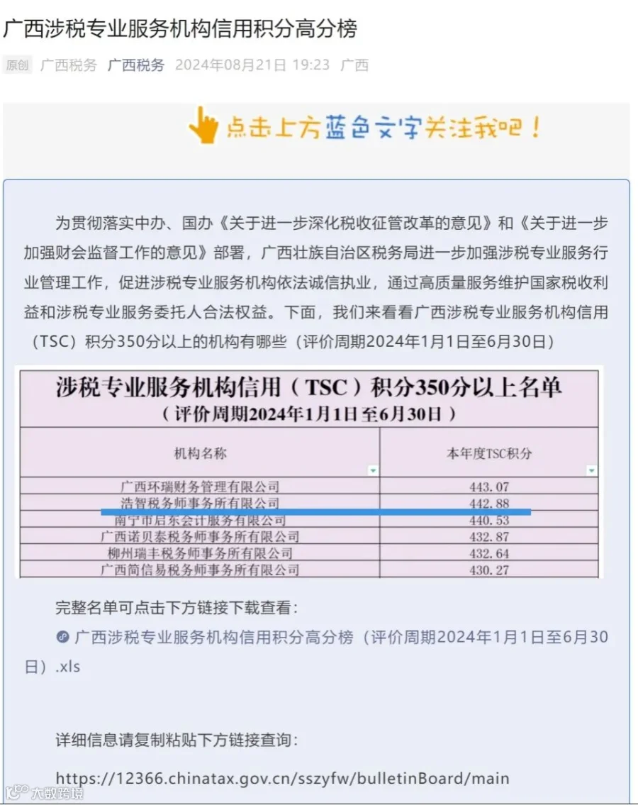 广西壮族自治区税务局为进一步加强涉税服务机构信用管理,释放纳税信用评定正向激励效应,坚持强化涉税专业服务机构信用评价结果运用,根据系统内自动生成的信用积分进行分级管理,对涉税专业服务机构信用(TSC)积分350分以上的涉税服务机构进行公示。浩智税务师事务所此次上榜广西涉税专业服务机构信用积分高分榜,是社会各界和政府部门对浩智长期以来规范发展、诚信经营的高度肯定。