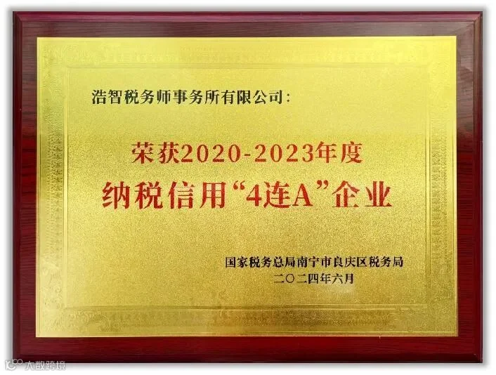荣获国家税务总局南宁市税务局2020-2023年度纳税信用“4连A”