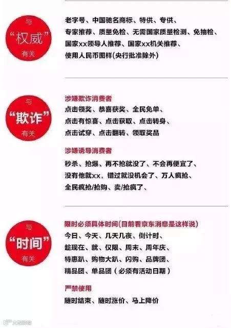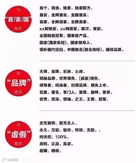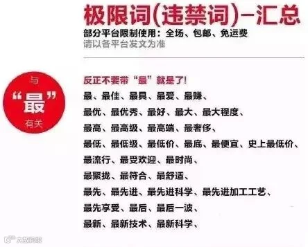 据悉,极限用语包括如下词汇:国家级、世界级、最高级、最佳、最大、第一、唯一、首个、首选、最好、最大、精确、顶级、最高、最低、最、最具、最便宜、最新、最先进、最大程度、最新技术、最先进科学、国家级产品、填补国内空白、绝对、独家、首家、最新、最先进、第一品牌、金牌、名牌、优秀、最先、顶级、独家、全网销量第一、全球首发、全国首家、全网首发、世界领先、顶级工艺、最新科学、最新技术、最先进加工工艺、最时尚、极品、顶级、顶尖、终极、最受欢迎、王牌、销量冠军、第一(NO.1\Top1)、极致、永久、王牌、掌门人、领袖品牌、独一无二、独家、绝无仅有、前无古人、史无前例、万能等。