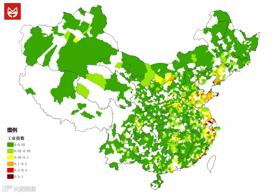 我从经济普查数据里找到了工业产值的指标,标准化以后落在全国尺度地图上,大概长这样: