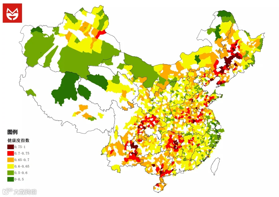 从图中可以看到,颜色越绿,也就是我们认为的环境越好。总体而言,环境比较好的地区在东北、西北、东南山区和整个西南地区。