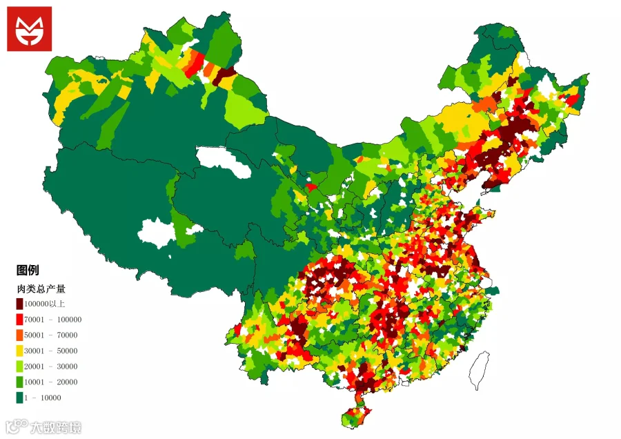 于是,我去打了个电话。一个计量经济学的好朋友发给了我一份全国县域经济普查数据。我找到了肉类产量这一经济指标,把它放到全国尺度去看,大概长这样: