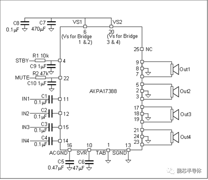 AXPA17388采用AB类放大器设计,在音质方面完胜D类音频功率放大器,并且不会对车上的其他设备产生电磁干扰。产品提供四路独立的信号通路,一颗芯片就能够满足车载应用左右及前后喇叭的驱动。高集成度的设计使得芯片的外围电路非常简单,只需要少量的输入耦合电容及SVR电容即可工作。芯片的输出采用桥式结构,外围电路不需要输出耦合电容和补偿电路,整体成本极大地降低。