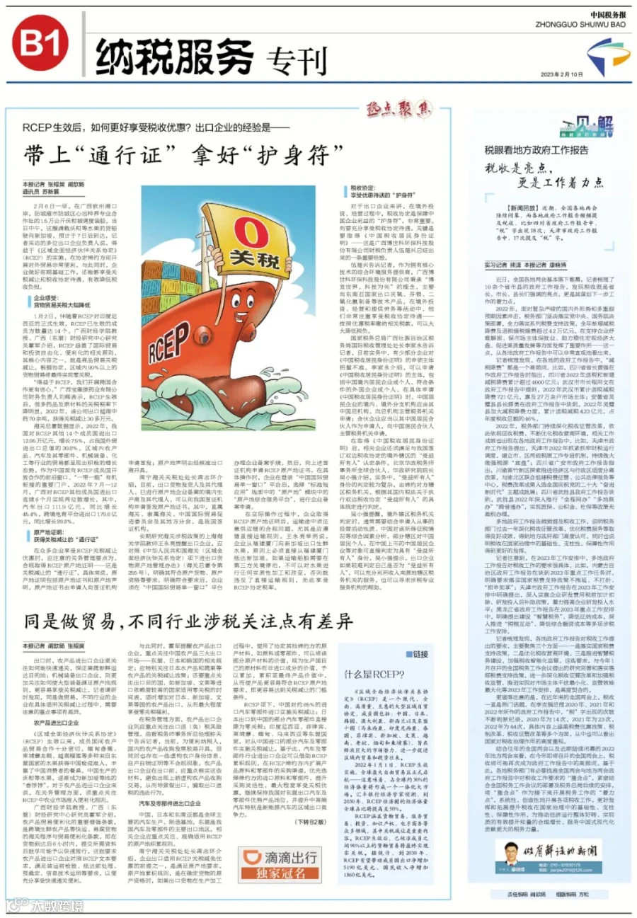 按:2023年2月10日《中国税务报》刊登了《RCEP生效后,如何更好享受税收优惠,出口企业的经验是——带上“通行证” 拿好“护身符”》和《同是做贸易,不同行业涉税关注点有差异》两篇文章,文中提到我所钟天宁女士相关观点,现在公众号转发,供读者参考。