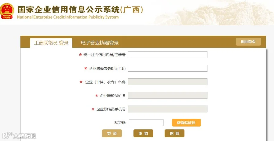 2、填写工商联络员信息并登陆,或根据系统要求采用电子营业执照、CA证书等方式登录;