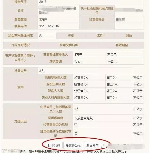 4、填写信息完整后,在预览确认无误后,点击“提交公示”,即已完成年报公示流程;