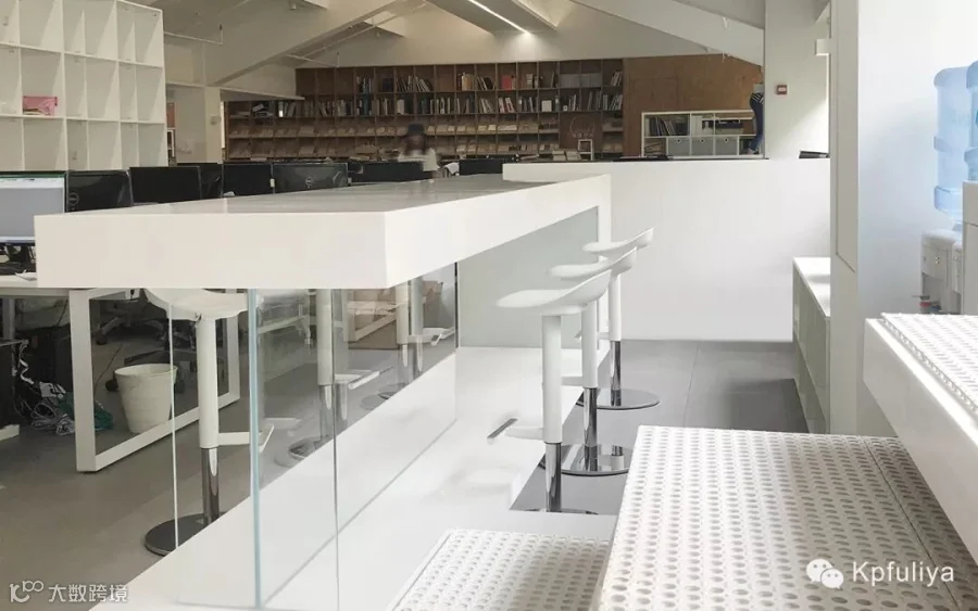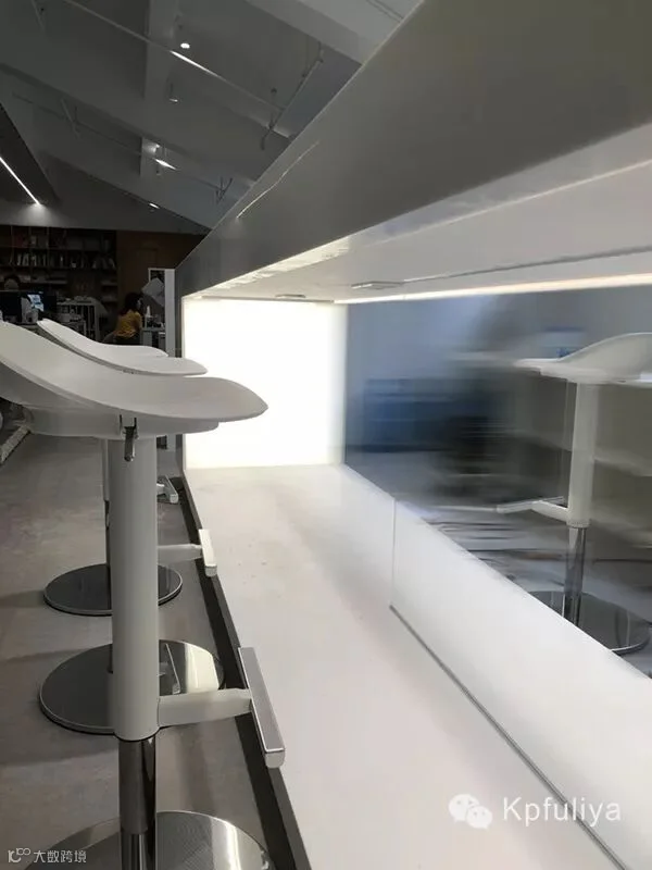 广州设计公司在办公室区域一角,用Koris®MA3583盐白打造一休闲区域。柔和的白色浅色调,能使视觉与大脑放松;高脚的吧台桌设计,加上灯光效果,打破了严肃呆板的日常办公室生活。