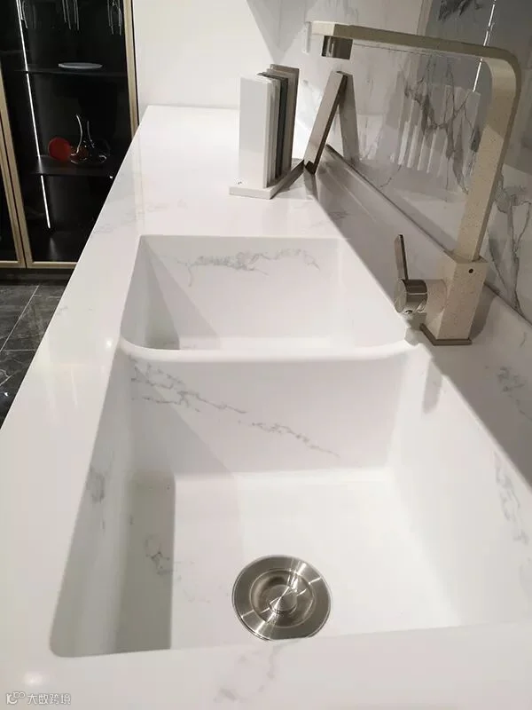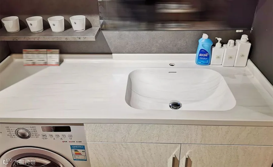 无缝拼接与可热弯的性能特点,在加热时会变得柔软,因此可以塑造成多种形状,也可以像木材一样,加工出细腻浑圆的边缘。案列中厨房台面与水槽一体成型,效果完美,便于清洁打理,也具视觉美感。