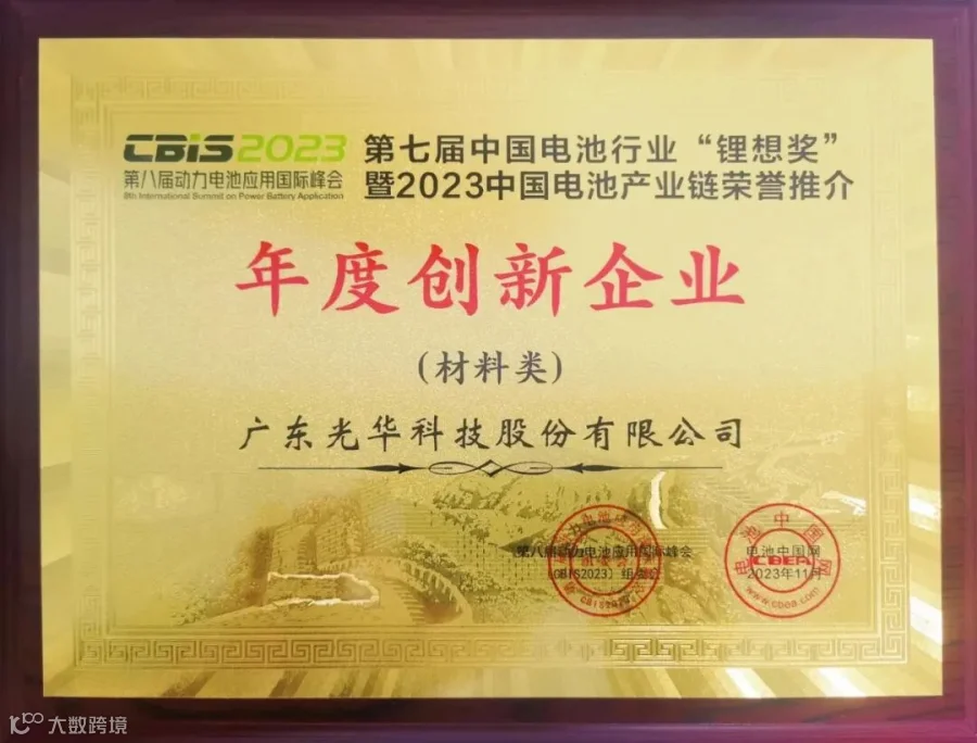 2023年11月28日-30日在上海召开“第八届动力电池应用国际峰会(CBIS2023)”,同期举行“第七届中国电池行业‘锂想奖’暨2023中国电池产业链荣誉推介”活动盛典,光华科技荣获“锂想奖”年度创新企业(材料类)。